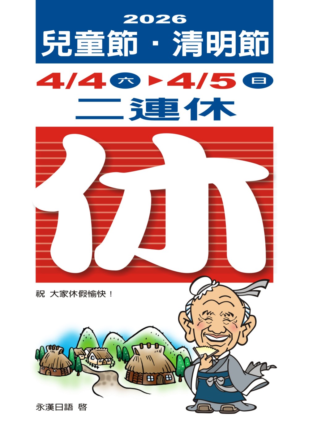 永漢日語文教機構 4/4 (六) ~ 4/5 (日) 休息停課二天,4/6 (一)正常營業上課!